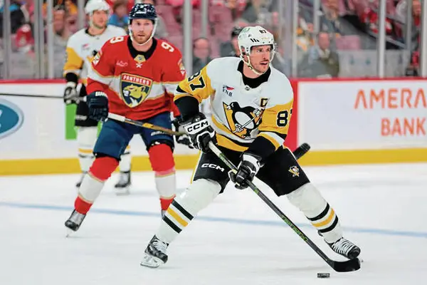 Digging a puck off Florida’s end boards following a goalmouth scramble, Penguins forward Bryan Rust fed a pass to the left faceoff dot where Crosby leaned down on his left knee and dropped the hammer on a one-timer that beat goaltender Sergei Bobrovsky, who was scrambling to get into position. Rust and forward Evgeni Malkin had assists.