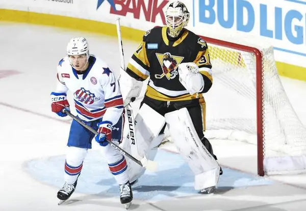 Goaltender Filip Larsson started the contest then was pulled after making seven saves on 11 shots in 19:49 of ice time. He was replaced by Maxim Pavelenko, who stopped 16 of 17 shots during 37:32 of ice time and was charged with the loss in his American Hockey League debut.