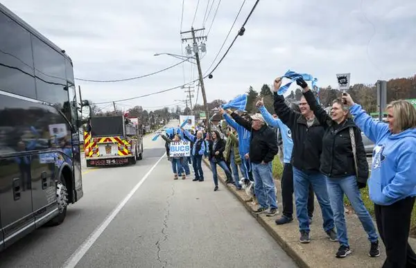 About 50 people gathered at the Burrell Plaza parking lot Friday morning to cheer the team on as it headed to York with a police and fire escort. Students at Bon Air Elementary and Charles A. Huston Middle schools also went outside to show the team support as it headed down Leechburg Road; Bon Air students held a pep rally on Thursday.