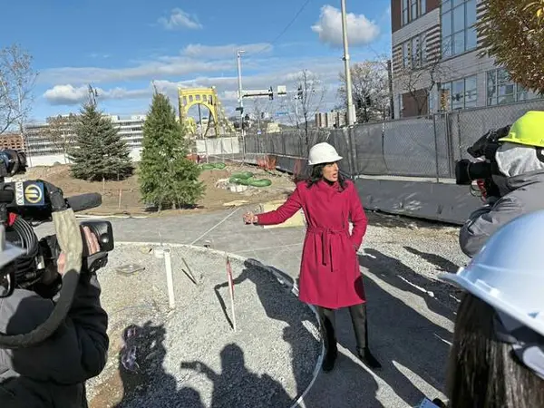 That’s just one aspect of the Arts Landing, a four-acre outdoor civic space, which will be operated by the Pittsburgh Cultural Trust. Located in the Cultural District, the $31 million outdoor destination is a part of the Downtown Revitalization Vision announced in 2024 by the Allegheny Conference on Community Development, Allegheny County, City of Pittsburgh, and Urban Redevelopment Authority, as well as Governor Josh Shapiro’s 10-year $600-million-dollar plan to rejuvenate Downtown Pittsburgh. Shapiro’s plan is to convert unused office space to affordable housing, bolster public safety and create more community spaces.