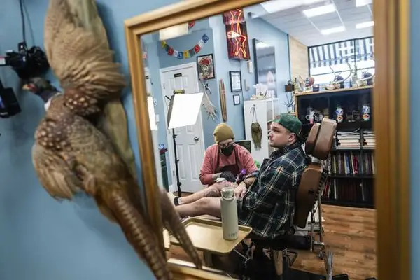 Peticca operates his studio in a Clay Avenue storefront with Kate Antoon of Jeannette, who operates her business, Gilded Violet Piercing Co.
