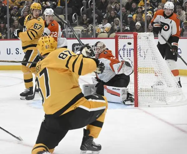 Off a puck battle from Philadelphia’s end boards, Malkin settled the puck below the left circle and coolly slid a pass to the far side of the crease, where Crosby pumped a wrister into a mostly vacant cage as Kolosov flashed his glove in vain. Malkin and forward Rickard Rakell registered assists.