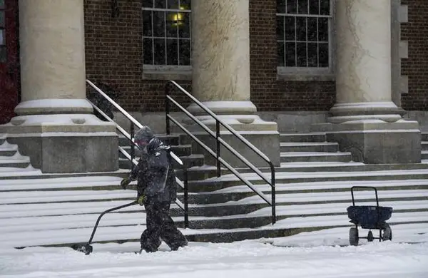 Maintenance worker Lance Jogun clears the sidewalk in front of the Greensburg Hempfield Area Library on January 24, 2026. (Sean Stipp | TribLive)