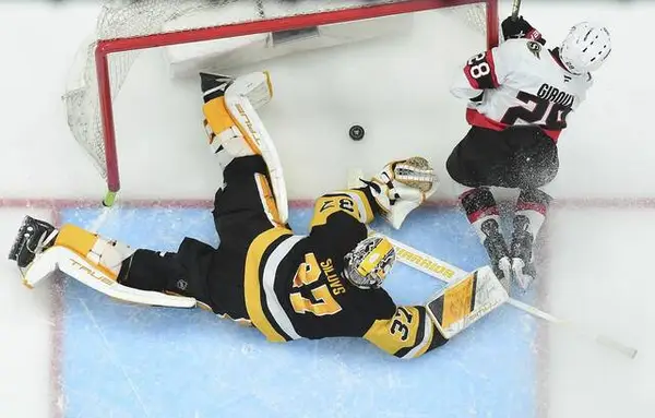 Penguins defenseman Ryan Shea tried to rush the puck up ice in front of the benches but lost it at Ottawa’s blue line on a poke check by Senators defenseman Jordan Spence. As Wotherspoon got jammed up at the home bench on an attempted change, Senators forward Drake Batherson took possession of the puck and generated a breakaway. After Batherson’s wrister was denied by the glove of a sprawling Silovs, Stutzle followed up on the sequence by cleaning up the rebound with a forehand shot past a helpless Silovs. Batherson and Spence secured assists.