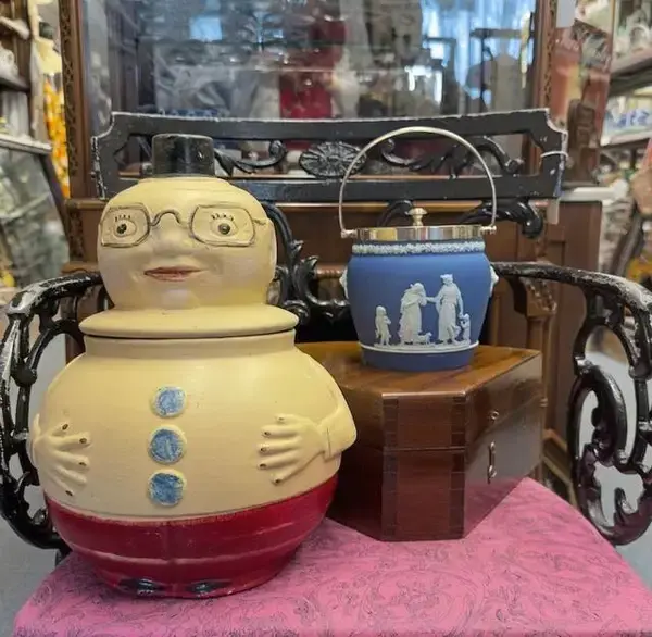 Poole has a ceramic British biscuit jar and a sought-after cookie jar called the “Roly Poly Preacher” from the 1940s in his shop. It was hand-painted and made by the Robinson-Ransbottom Pottery Co. in Roseville, Ohio.