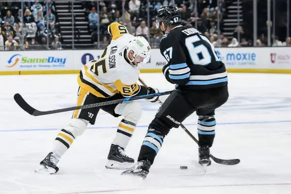 From in front of the home bench, Penguins forward Connor Dewar flipped the puck into Utah’s end boards. Former Penguins defenseman John Marino was a bit too casual in recovering the puck and allowed a forechecking Acciari to claim possession, then bank a pass off the right-wing boards to the near point for Karlsson. Holding the puck for a moment, Karlsson offloaded across the ice to Wotherspoon. Waiting for a lane to open, Wotherspoon directed a wrister to the far side of the net, which was denied by Vejmelka’s right leg. Acciari outbattled Schmidt for the rebound and mashed a forehand shot into a mostly vacant cage as he fell to his knees. Wotherspoon and Karlsson claimed assists.