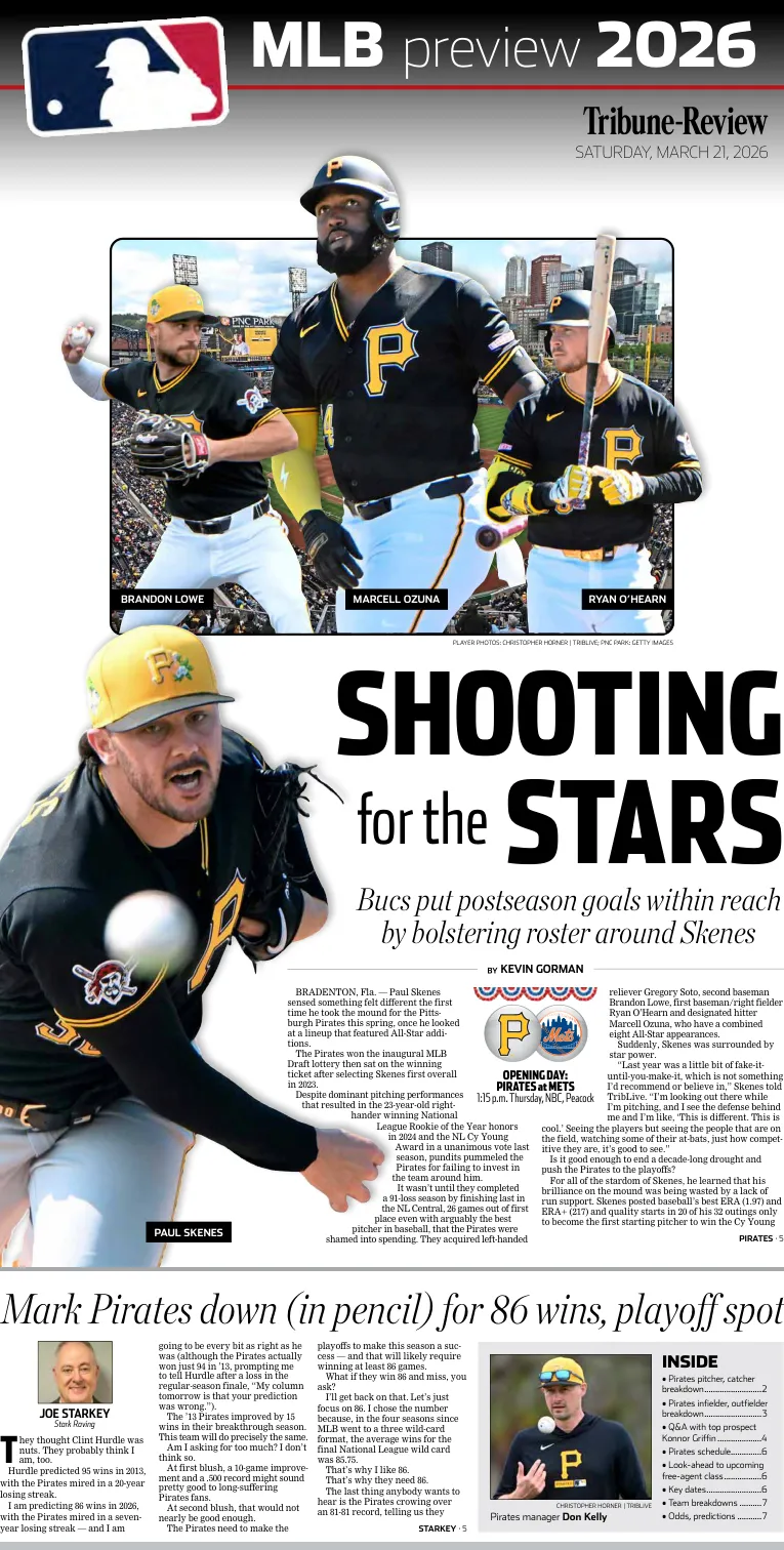 Reigning NL Cy Young winner Paul Skenes will start the season-opener Thursday at Citi Field, followed by Mitch Keller on Saturday (Friday is an off day). After the Pirates wrap up in New York, they will travel to Cincinnati, where righties Braxton Ashcraft and Bubba Chandler are slated to start vs. the Reds on March 30 and 31.