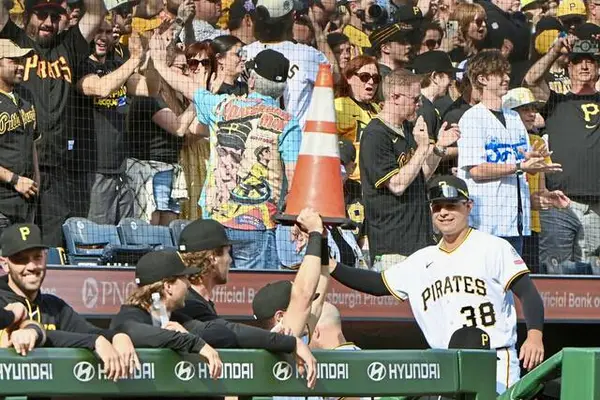 Second baseman Nick Yorke said the cone was inspired by a misprint on a Fanatics T-shirt that said “hoist the cone,” rather than the intended phrase, “hoist the colors.” He said after the cone was introduced in the dugout in Cincinnati, the Bucs had a good series and the celebration ended up sticking.