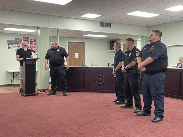 Volunteer firefighters Dan Copeland and Joseph Stanga, and police Sgt. Fred Hockenberry, were recognized by Mayor Joel Anderson during Springdale’s council meeting.