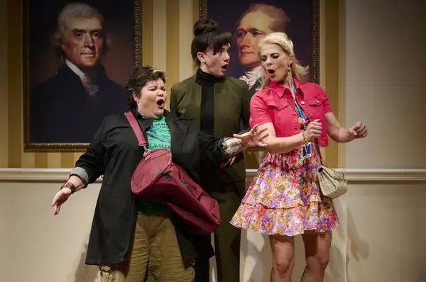 Most memorable of all are Lara Hayhurst, who plays the president’s underestimated mistress Dusty as sparkling and guileless but with some hidden talents, and Theo Allyn as presidential secretary Stephanie, the most physical in a highly physical comedy with bursts of slapstick perfection. It’s no coincidence that one of the show’s highlights is a late-second-act musical scene between the two of them that brought cheers from the audience.