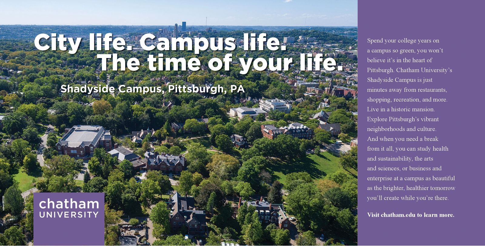 City life. Campus life! The time of your life. Shadyside Campus, Pittsburgh, PA chatham UNIVERSITY Spend your college years on a campus so green, you won't believe it's in the heart of Pittsburgh. Chatham University's Shadyside Campus is just minutes away from restaurants, shopping, recreation, and more. Live in a historic mansion. Explore Pittsburgh's vibrant neighborhoods and culture. And when you need a break from it all, you can study health and sustainability, the arts and sciences, or business and enterprise at a campus as beautiful as the brighter, healthier tomorrow you'll create while you're there. Visit chatham.edu to learn more. City life . Campus life ! The time of your life . Shadyside Campus , Pittsburgh , PA chatham UNIVERSITY Spend your college years on a campus so green , you won't believe it's in the heart of Pittsburgh . Chatham University's Shadyside Campus is just minutes away from restaurants , shopping , recreation , and more . Live in a historic mansion . Explore Pittsburgh's vibrant neighborhoods and culture . And when you need a break from it all , you can study health and sustainability , the arts and sciences , or business and enterprise at a campus as beautiful as the brighter , healthier tomorrow you'll create while you're there . Visit chatham.edu to learn more .