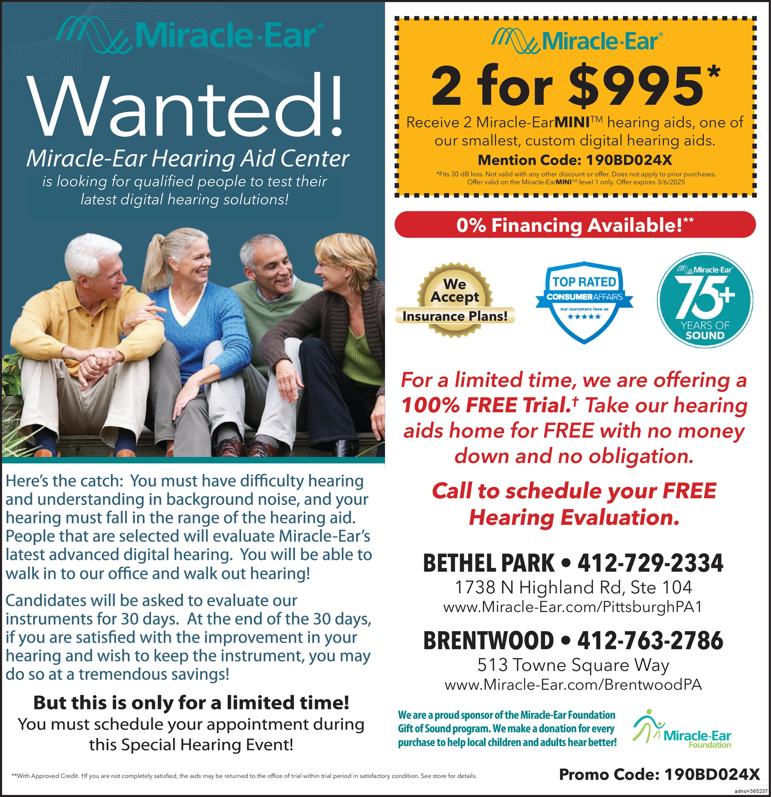 Miracle-Ear Wanted! Miracle-Ear Hearing Aid Center is looking for qualified people to test their latest digital hearing solutions! Miracle-Ear 2 for $995* Receive 2 Miracle-EarMINITM hearing aids, one of our smallest, custom digital hearing aids. Mention Code: 190BD024X *Fits 30 dB loss. Not valid with any other discount or offer. Does not apply to prior purchases. Offer valid on the Miracle-Ear MINITM level 1 only. Offer expires 3/6/2025 0% Financing Available!** We Accept Insurance Plans! TOP RATED CONSUMER AFFAIRS our customers love us Miracle-Ear 75+ YEARS OF SOUND Here's the catch: You must have difficulty hearing and understanding in background noise, and your hearing must fall in the range of the hearing aid. People that are selected will evaluate Miracle-Ear's latest advanced digital hearing. You will be able to walk in to our office and walk out hearing! Candidates will be asked to evaluate our instruments for 30 days. At the end of the 30 days, if you are satisfied with the improvement in your hearing and wish to keep the instrument, you may do so at a tremendous savings! But this is only for a limited time! You must schedule your appointment during this Special Hearing Event! For a limited time, we are offering a 100% FREE Trial. Take our hearing aids home for FREE with no money down and no obligation. Call to schedule your FREE Hearing Evaluation. BETHEL PARK 412-729-2334 1738 N Highland Rd, Ste 104 www.Miracle-Ear.com/Pittsburgh PA1 BRENTWOOD 412-763-2786 513 Towne Square Way www.Miracle-Ear.com/Brentwood PA We are a proud sponsor of the Miracle-Ear Foundation Gift of Sound program. We make a donation for every purchase to help local children and adults hear better! **With Approved Credit. If you are not completely satisfied, the aids may be returned to the office of trial within trial period in satisfactory condition. See store for details. Miracle-Ear Foundation Promo Code: 190BD024X adno=365237 Miracle - Ear Wanted ! Miracle - Ear Hearing Aid Center is looking for qualified people to test their latest digital hearing solutions ! Miracle - Ear 2 for $ 995 * Receive 2 Miracle - EarMINITM hearing aids , one of our smallest , custom digital hearing aids . Mention Code : 190BD024X * Fits 30 dB loss . Not valid with any other discount or offer . Does not apply to prior purchases . Offer valid on the Miracle - Ear MINITM level 1 only . Offer expires 3/6/2025 0 % Financing Available ! ** We Accept Insurance Plans ! TOP RATED CONSUMER AFFAIRS our customers love us Miracle - Ear 75+ YEARS OF SOUND Here's the catch : You must have difficulty hearing and understanding in background noise , and your hearing must fall in the range of the hearing aid . People that are selected will evaluate Miracle - Ear's latest advanced digital hearing . You will be able to walk in to our office and walk out hearing ! Candidates will be asked to evaluate our instruments for 30 days . At the end of the 30 days , if you are satisfied with the improvement in your hearing and wish to keep the instrument , you may do so at a tremendous savings ! But this is only for a limited time ! You must schedule your appointment during this Special Hearing Event ! For a limited time , we are offering a 100 % FREE Trial . Take our hearing aids home for FREE with no money down and no obligation . Call to schedule your FREE Hearing Evaluation . BETHEL PARK 412-729-2334 1738 N Highland Rd , Ste 104 www.Miracle-Ear.com/Pittsburgh PA1 BRENTWOOD 412-763-2786 513 Towne Square Way www.Miracle-Ear.com/Brentwood PA We are a proud sponsor of the Miracle - Ear Foundation Gift of Sound program . We make a donation for every purchase to help local children and adults hear better ! ** With Approved Credit . If you are not completely satisfied , the aids may be returned to the office of trial within trial period in satisfactory condition . See store for details . Miracle - Ear Foundation Promo Code : 190BD024X adno = 365237
