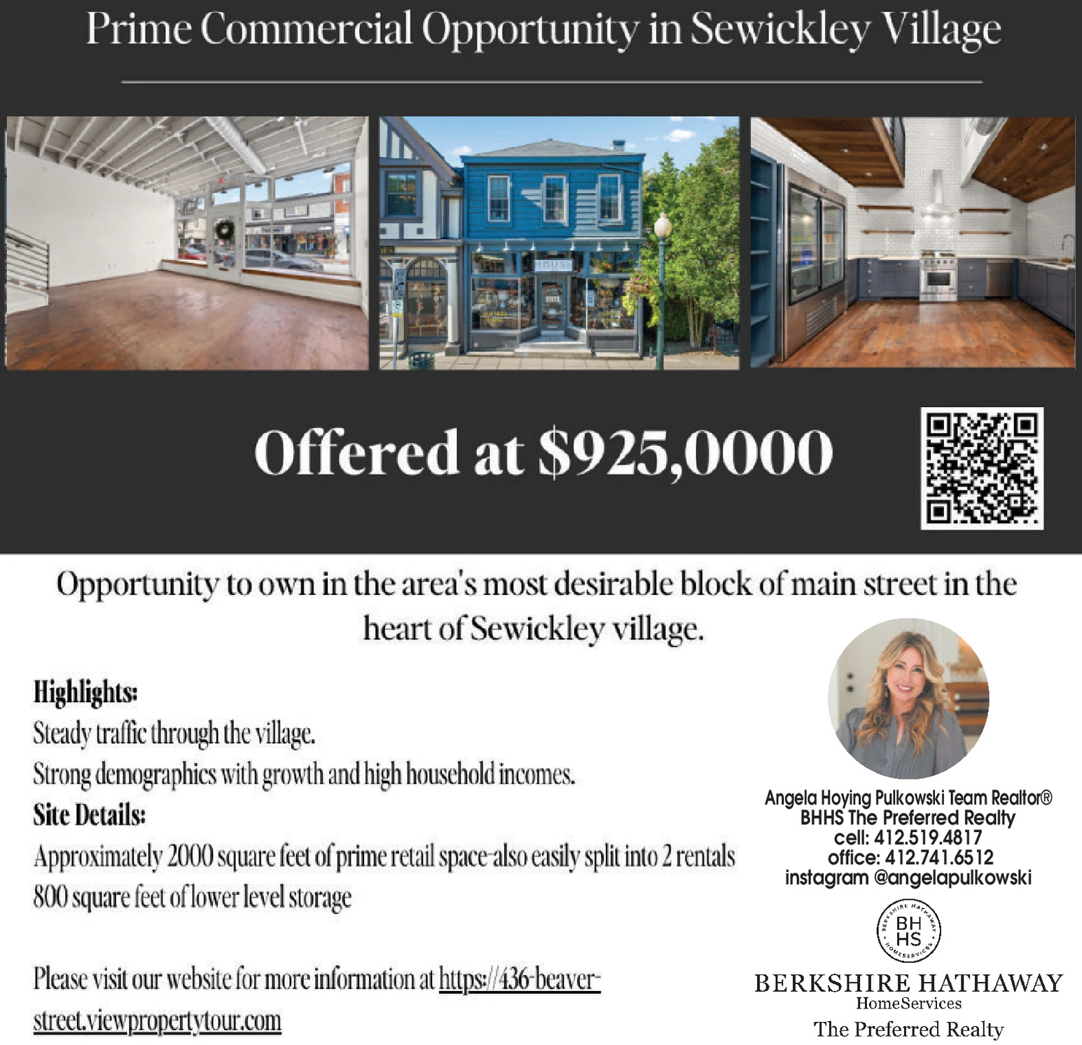 Prime Commercial Opportunity in Sewickley Village Offered at $925,0000 Opportunity to own in the area's most desirable block of main street in the heart of Sewickley village. Highlights: Steady traffic through the village. Strong demographics with growth and high household incomes. Site Details: Approximately 2000 square feet of prime retail space also easily split into 2 rentals 800 square feet of lower level storage Please visit our website for more information at https://436-beaver street.viewpropertytour.com Angela Hoying Pulkowski Team Realtor® BHHS The Preferred Realty cell: 412.519.4817 office: 412.741.6512 instagram @angelapulkowski SHIRE HAT BH HS BERKSHIRE HATHAWAY HomeServices The Preferred Realty Prime Commercial Opportunity in Sewickley Village Offered at $ 925,0000 Opportunity to own in the area's most desirable block of main street in the heart of Sewickley village . Highlights : Steady traffic through the village . Strong demographics with growth and high household incomes . Site Details : Approximately 2000 square feet of prime retail space also easily split into 2 rentals 800 square feet of lower level storage Please visit our website for more information at https : // 436 - beaver street.viewpropertytour.com Angela Hoying Pulkowski Team Realtor® BHHS The Preferred Realty cell : 412.519.4817 office : 412.741.6512 instagram @angelapulkowski SHIRE HAT BH HS BERKSHIRE HATHAWAY HomeServices The Preferred Realty