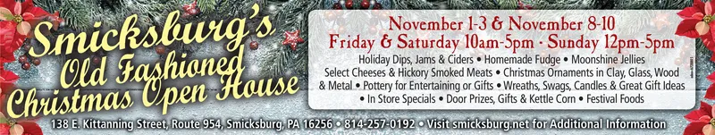 Smicksburg's November 1-3 & November 8-10 Friday & Saturday 10am-5pm Sunday 12pm-5pm Holiday Dips, Jams & Ciders Homemade Fudge Moonshine Jllies Select Cheeses & Hickory Smoked Meats Christmas Ornaments in Clay, Glass, Wood & Metal Pottery for Entertaining or Gifts Wreaths, Swags, Candles & Great Gift Ideas .In Store Specials Door Prizes, Gifts & Kettle Con Festival Foods 138 E. Kittanning Street, Route 954 Smicksburg, PA 16256 814-257-0192 Visit smicksburg.net for Additional Information s Christmas ined Smicksburg's November 1-3 & November 8-10 Friday & Saturday 10am-5pm Sunday 12pm-5pm Holiday Dips, Jams & Ciders Homemade Fudge Moonshine Jllies Select Cheeses & Hickory Smoked Meats Christmas Ornaments in Clay, Glass, Wood & Metal Pottery for Entertaining or Gifts Wreaths, Swags, Candles & Great Gift Ideas .In Store Specials Door Prizes, Gifts & Kettle Con Festival Foods 138 E. Kittanning Street, Route 954 Smicksburg, PA 16256 814-257-0192 Visit smicksburg.net for Additional Information s Christmas ined