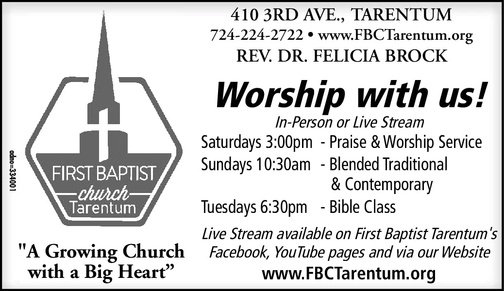 FIRST BAPTIST -church- Tarentum "A Growing Church with a Big Heart" 410 3RD AVE., TARENTUM 724-224-2722 www.FBCTarentum.org REV. DR. FELICIA BROCK Worship with us! In-Person or Live Stream Saturdays 3:00pm - Praise & Worship Service Sundays 10:30am - Blended Traditional & Contemporary Tuesdays 6:30pm - Bible Class Live Stream available on First Baptist Tarentum's Facebook, YouTube pages and via our Website www.FBCTarentum.org adno=334001 FIRST BAPTIST -church- Tarentum " A Growing Church with a Big Heart " 410 3RD AVE . , TARENTUM 724-224-2722 www.FBCTarentum.org REV . DR . FELICIA BROCK Worship with us ! In - Person or Live Stream Saturdays 3:00 pm - Praise & Worship Service Sundays 10:30 am - Blended Traditional & Contemporary Tuesdays 6:30 pm - Bible Class Live Stream available on First Baptist Tarentum's Facebook , YouTube pages and via our Website www.FBCTarentum.org adno = 334001